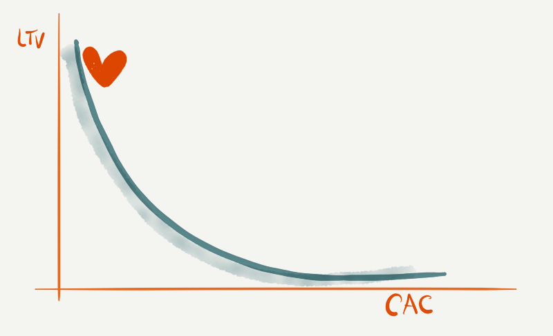 When you are successfully targeting your early adopter, it is safe to slowly start expanding your focus to a wider audience. Looking at the LTV/CAC graph you start moving to the right. This new customer segment is probably not willing to pay as much as your early adopter and will not want to put the same effort in trying your product. Your cost of acquisition will also be higher, but there should also be more of them. You can only target this next group when you are able to do the investment in time and money to reach and convince them. That is why it is so important to start with the early adopter.